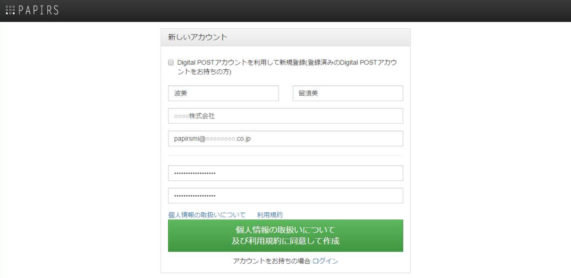 Digital POSTに登録しているメールアドレス、パスワードを入力し、「個人情報の取扱いについて」、「利用規約」を確認の上、「個人情報の取扱いについて及び利用規約に同意して作成」をクリックします。