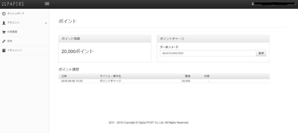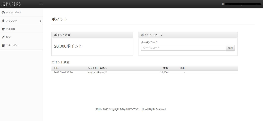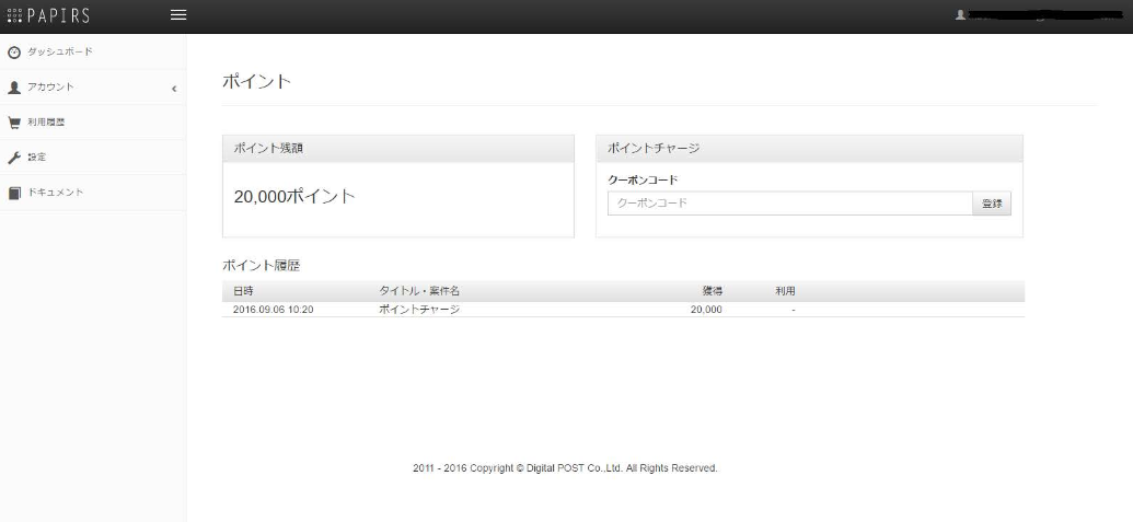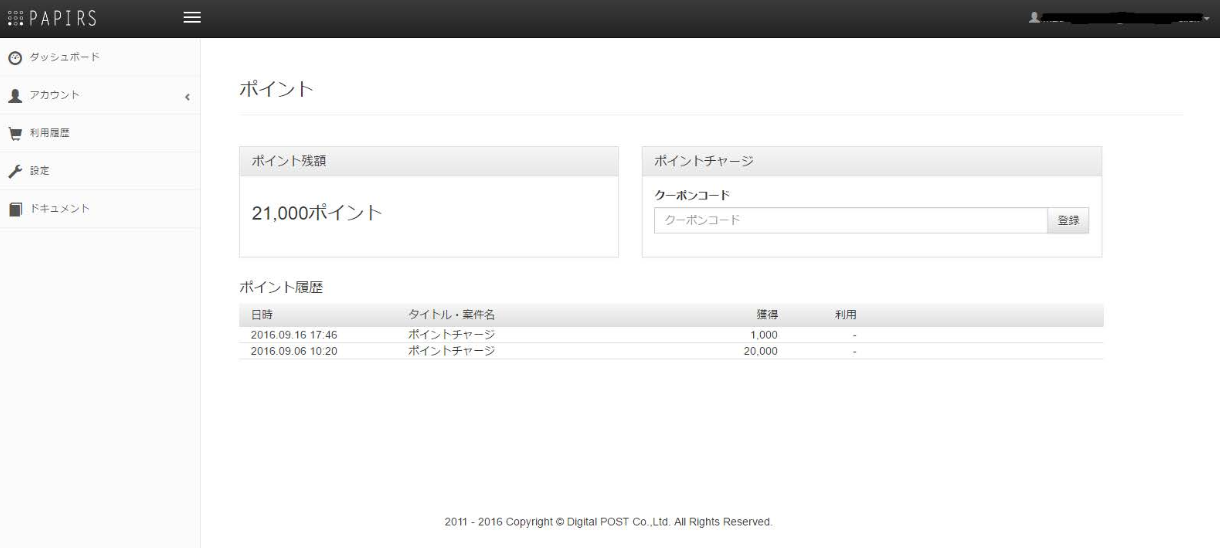 ポイントページでは、ポイント残額の確認、ポイント履歴の確認、クーポンコードからのポイントチャージができます。
