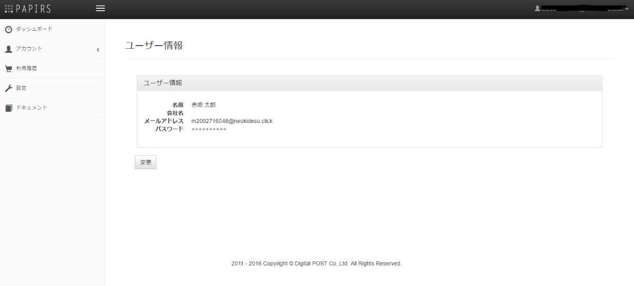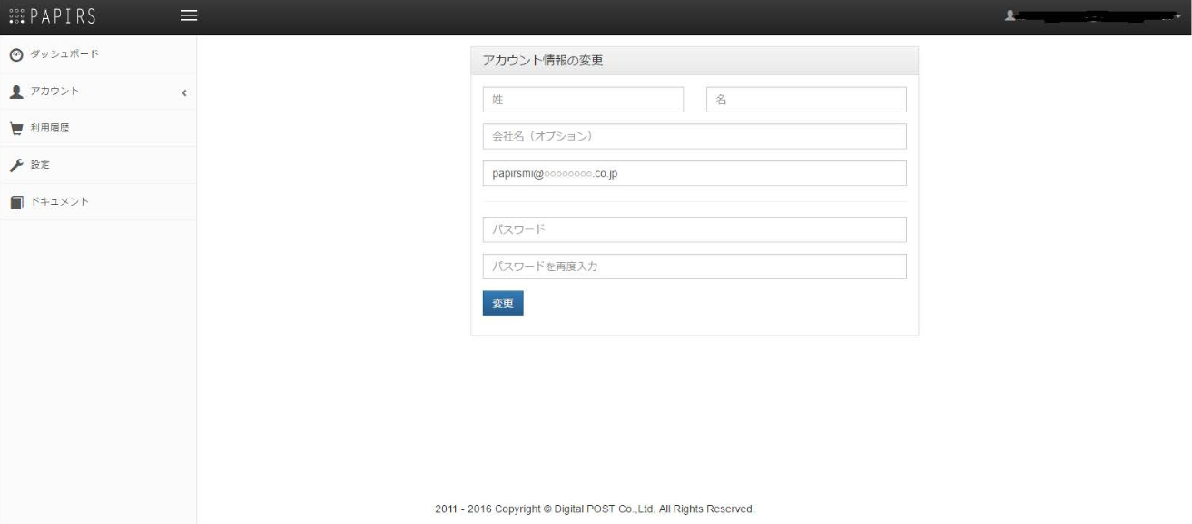 アカウント情報の変更画面が開きます。変更内容を入力して、「変更」ボタンをク リックします。